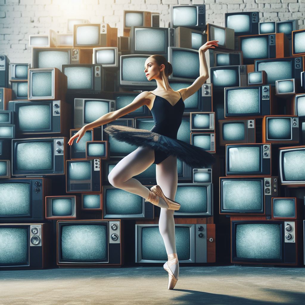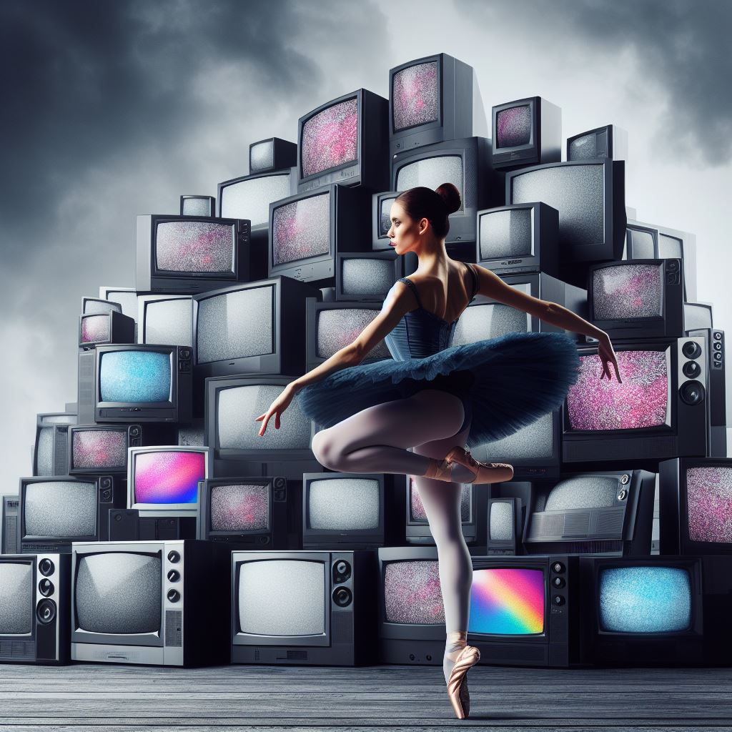 Just for the heck of it, I copied "professional dancer (ballroom or ballet) dancing in front of a pile of televisions- in a way that it looks like the televisions are watching her" [changed it to professional ballet dancer] and this was created....
