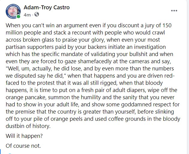 I liked this comment:ex-khobar Andy wrote: ↑Fri Sep 24, 2021 3:56 pmAnd that idiotic biased expensive unscientific Arizona audit of the November vote has decided that Biden was undercounted by 99 and Trump overcounted by 261 votes.