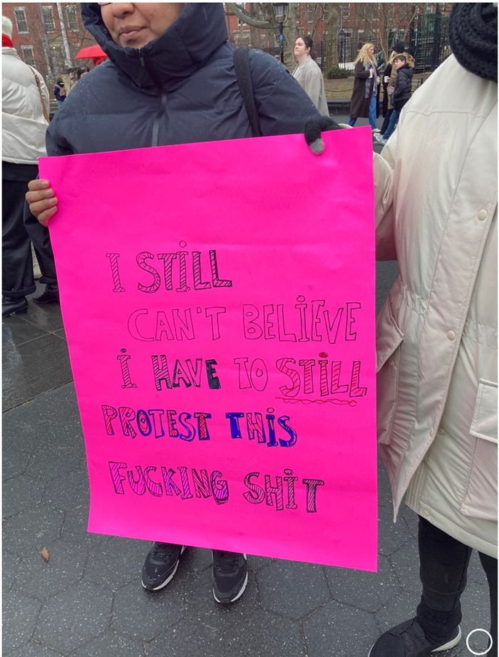 I still have not figured out how to post a photo. If someone is able to take that link and make it into a posted photo please go ahead. Anyway I was on the Women's March (now called the People's March because Women's Rights are Human Rights) in NYC today and I took a pic of this sign which says: " I can't believe I still have to protest this fucking shit"