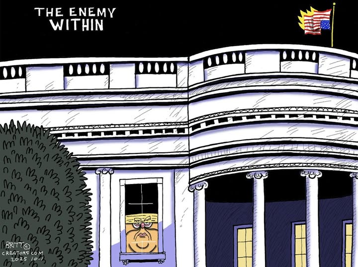 Secretary of War Crimes Pete Hegseth tells top brass there are no longer any "rules of engagement" for the US military; Il Douche says he will use the military against "the enemy within" in American cities.