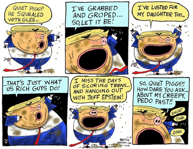 Sure, BSG. I see a nine panel cartoon with clever rhymes about Trumps calling (screaming at?) a female reporter who asked him a question about Epstein on some recent flight onboard Air ForceOne, Piggy. I have not heard anybody speaking to Trumps statement that he seeks more federal investigation into this stuff because all those friends of Epstein were Democrats. Yeah, that includes the active Democrat arm in arm with Epstein named Donald J. Trump.