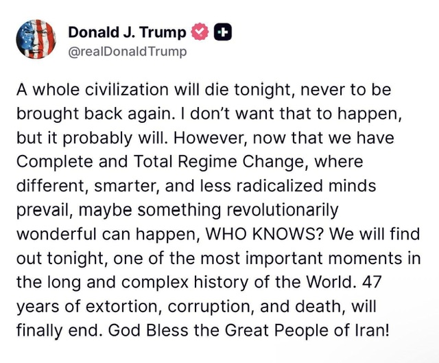 I'm sure everyone here already knows that deliberately destroying civilian infrastructure to cause suffering is a war crime. It will certainly be interesting to see if the military commanders are willing to risk prison for giving/following illegal orders. I hope that when Democrats regain power the DOJ prosecutes everyone involved in all of these crimes. (I still blame Obama for not prosecuting the Bush Administration cabal that authorized torture during the Iraq war fiasco.)