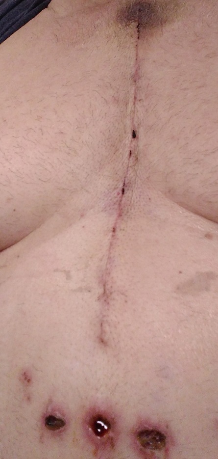 BSG and RayT - after the triple by-pass. The holes are where three drains were stuck to remove juices from whatever cavities there are in there.