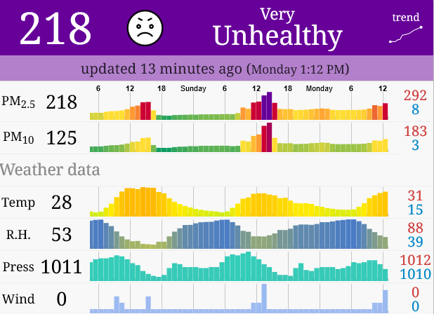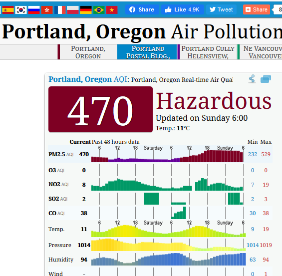 We're at 325 hazardous today. Yesterday we had the worst air quality in the world, the smoke just kept getting thicker and thicker until visibility was about 1/2 mile. Cooler air, ocean breezes and then some light rain is in the forecast for the next week, so we should be getting better air soon.