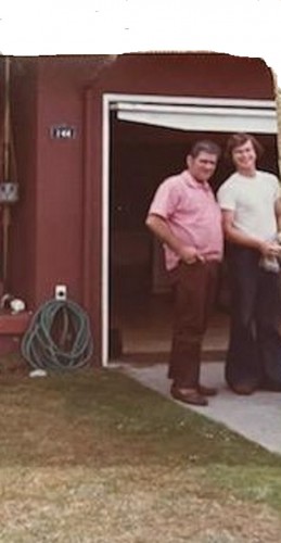 The funniest thing to me about this photo is the bell bottoms I'm wearing. Also, I'm wondering what was wrong with the lawn. My father always took very good care of it. Maybe that was during another drought. I remember that on my parents block, everybody had a front lawn. During the drought there were a lot of brown lawns around.