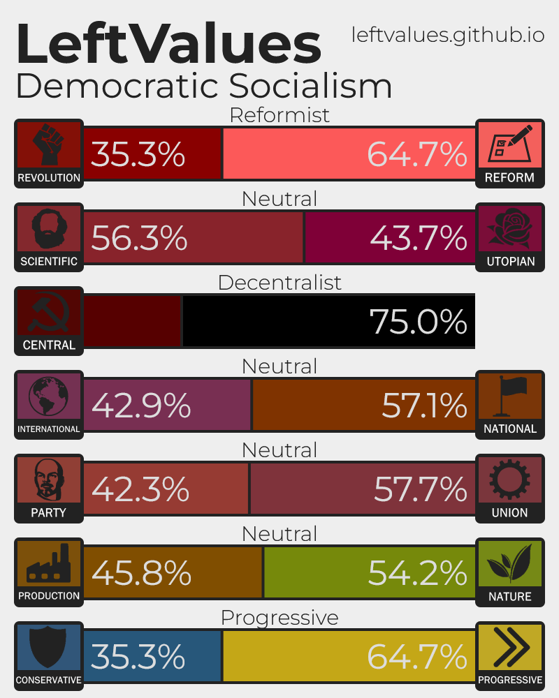 Democratic Socialism is a form of socialism that seeks to utilize liberal democracy as a means to achieve a socialist economy and society. Democratic Socialists reject revolution and a centrally planned economy, instead supporting moderate social ownership in the form of publicly owned utilities and democratic workplace self-management.