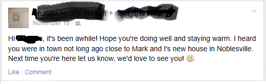 I don't like using "my and Mark's" - it's logical but ugly. However, it is nowhere near the ugliness of "Mark and I's" (good grief!). Move over, Hyacinth Bucket!It's been a while. Hope you're doing well and staying warm. I heard you were in town not long ago, close to my and Mark's new house in Nobleville. Next time you're here, let us know. We'd love to see you.