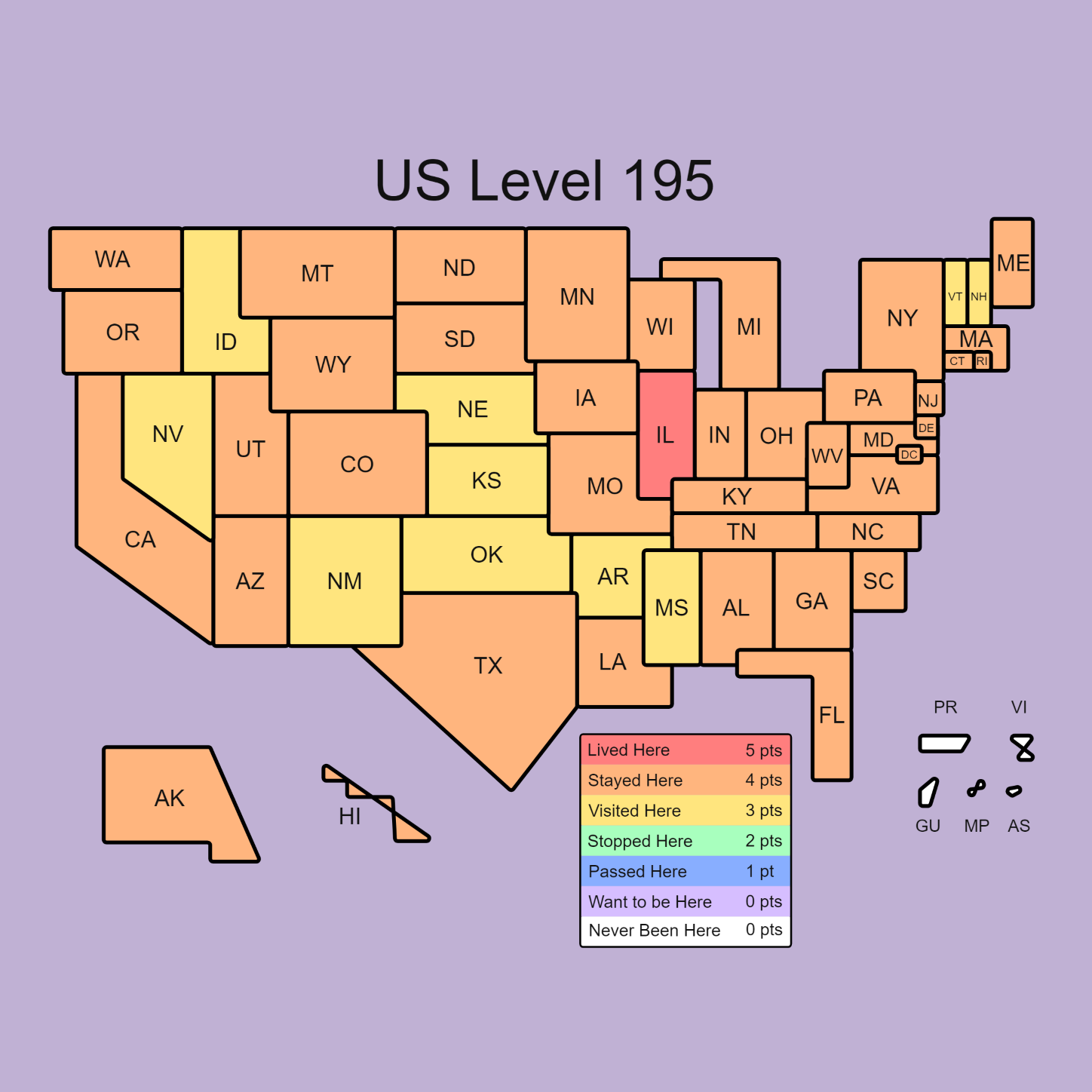 Since I've been in every state but HI and ME, I was surprised to get only 168. Granted some states were very short visits just so I could say I've been in them. ND and LA come to mind.
